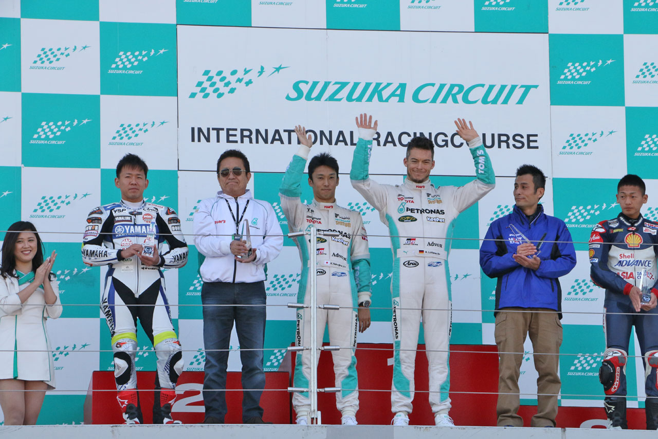 鈴鹿モータースポーツファン感謝デー2015 ピット・グリッドウォーク中に行われた鈴鹿モータースポーツ顕彰。トムスが特別賞を受賞し、舘信秀監督、中嶋一貴、アンドレ・ロッテラーも登壇