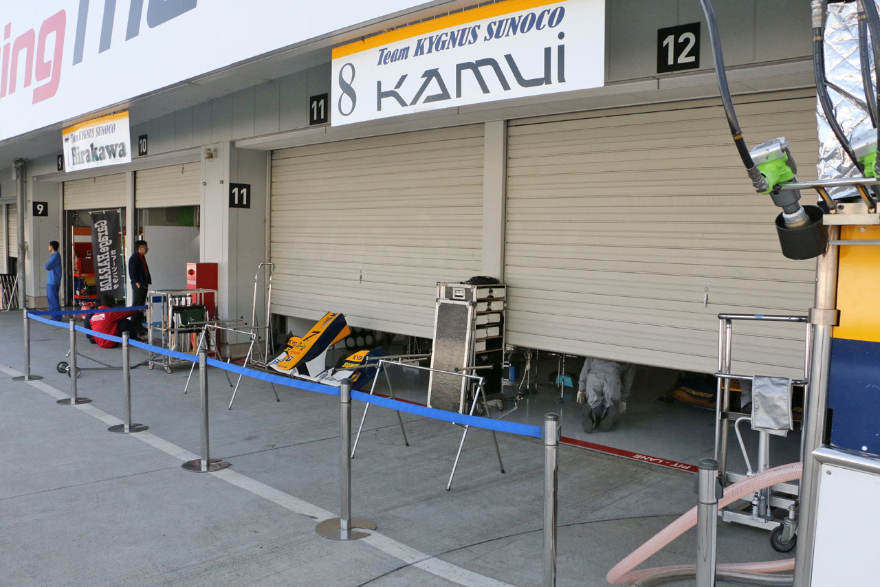 15年スーパーフォーミュラ第1戦鈴鹿 小林可夢偉が参戦するKYGNUS SUNOCO Team LeMansのピット前。ここだけ前ピット前に仕切りがしてあった。