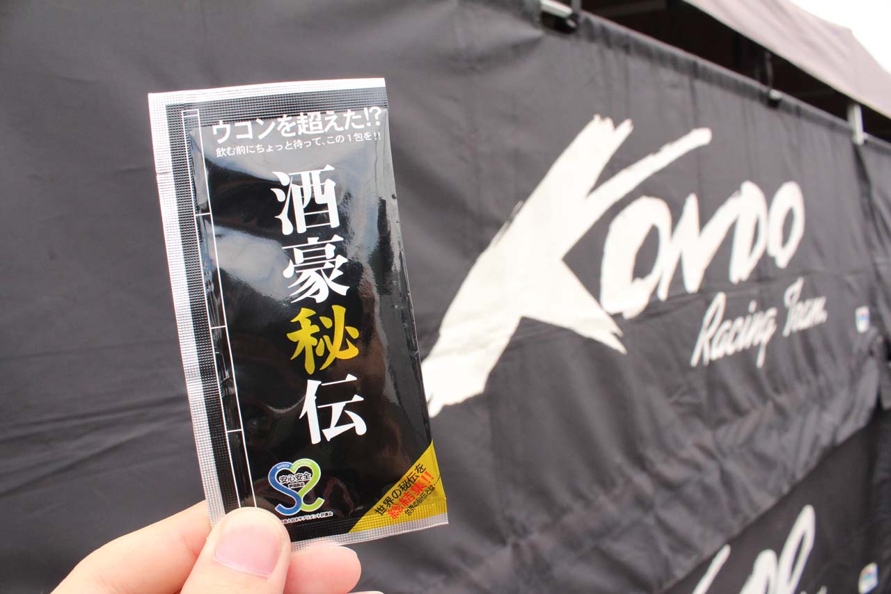 15年スーパーフォーミュラ第2戦岡山 こちらが配られていた『酒豪秘伝』。世界各国の秘伝素材を凝縮した、二日酔い対策サプリだそうです。開けてみると漢方薬の香りを感じましたが苦味はなく、飲み込みやすいサプリでした。お酒の後には、どのくらい効果があるのかな?