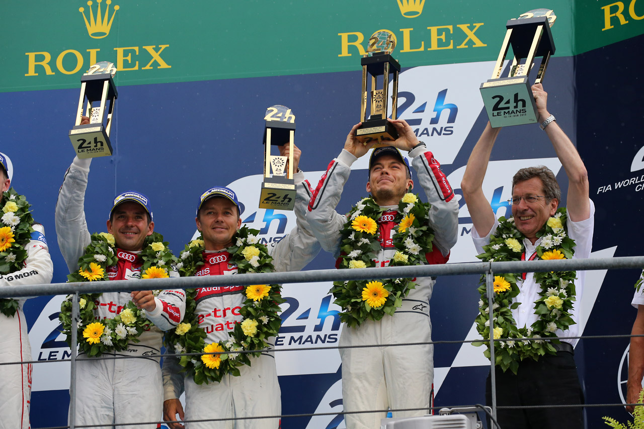 ル・マン/WEC フォト 【写真23434】ポルシェ完勝! 98年以来のル・マン制覇を果たす(4) 投稿日: 2015.06.15 00:00 15ル・マン24時間 3位に入った7号車アウディR18 e-トロン・クワトロのドライバーたち © Masahide Kamio