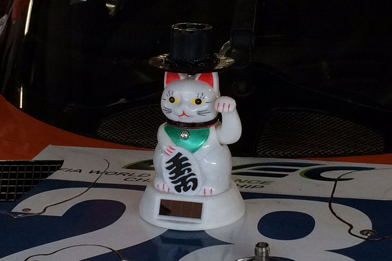 ル・マン/WEC フォト 【写真25189】WEC第6戦富士初日トピックス(2) 投稿日: 2015.10.10 00:00 WEC第6戦富士 招き猫です。これは、ル・マン24時間レースの際に、28号車に乗るルイス・フェリペ・デラーニ選手の日本人の友人が、“幸運の印に”とプレゼントしたモノ © Yumiko Kaijima