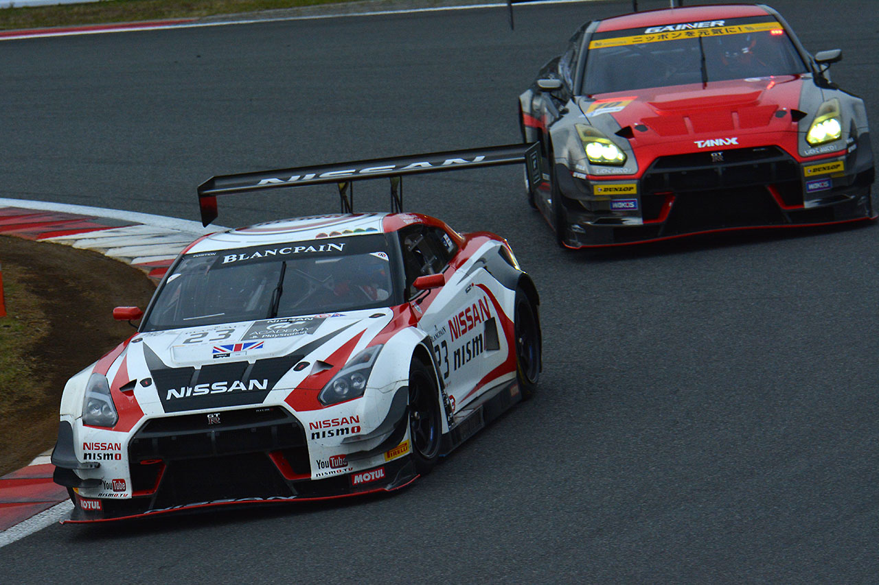 スーパーGT フォト 【写真26128】NISMO FESTIVAL 2015 フォトギャラリー 投稿日: 2015.11.29 00:00 NISMO FESTIVAL 2015 日本のスーパーGT300クラスのチャンピオンカー、GAINER TANAX GT-Rと競り合うブランパン耐久のチャンピオンカー、23号車GT-R © Ryuji Hirano