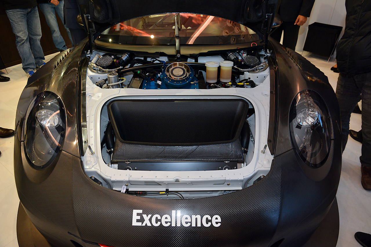 スーパーGT フォト 【写真26492】日本初登場の新ポルシェ911 GT3Rが汐留に見参 投稿日: 2016.01.09 00:00 新ポルシェ911 GT3Rのフロントボンネット内。ラジエターは中央にまとめられたが、容量が大きくなっているという © Ryuji Hirano