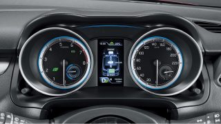 またハイブリッド専用デザインとして、エクステリアではクロームメッキ加飾付フロントグリルを、インテリアではブルーの加飾を施したシフトノブやブルーイルミネーションを備えたメーターを採用。そのタコメーター内には、モーターの作動状態を表示するモーターパワーメーターも装備している。