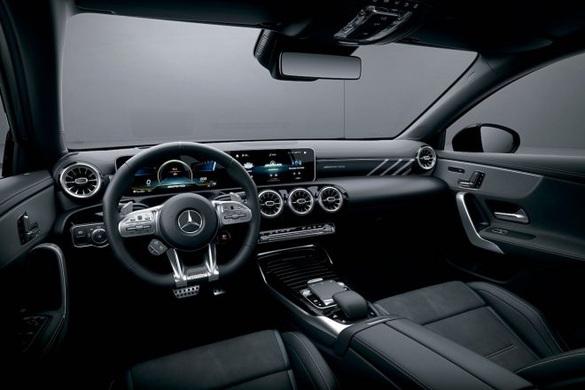 その出力を路面に伝える駆動系には、パフォーマンス志向のトルク可変配分4輪駆動のAMG 4MATICを採用し、後100:0から50:50までの範囲でトルク配分比を可変することが可能に。強化ブレーキシステムは耐フェード性に優れるとともに制動距離も短縮し、サイズは実績ある先代A45 4MATICのものと同一で、新型モノブロック対向4ピストン採用のフロントで350mm、1ピストンフローティングのリヤで330mmのディスク径がおごられている。