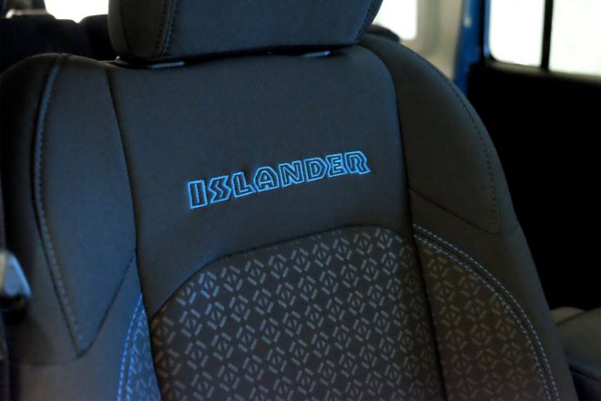 また、インテリアでは、爽やかな外装と統一感のあるセラミックホワイトインストルメントパネルや、ISLANDERロゴおよびサーフブルーのステッチがあしらわれた布製バケットシートを装備。