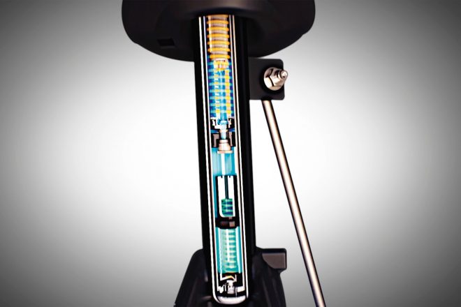 通常のツインチューブダンパーの構造に第2のダンパーシリンダーを追加し、ストロークが進むとセカンダリーピストンがシリンダーに入り込みハイドローリックバンプストップとして作用する、いわゆる位置依存型(ポジション・センシティブ)ダンパーとなっている。