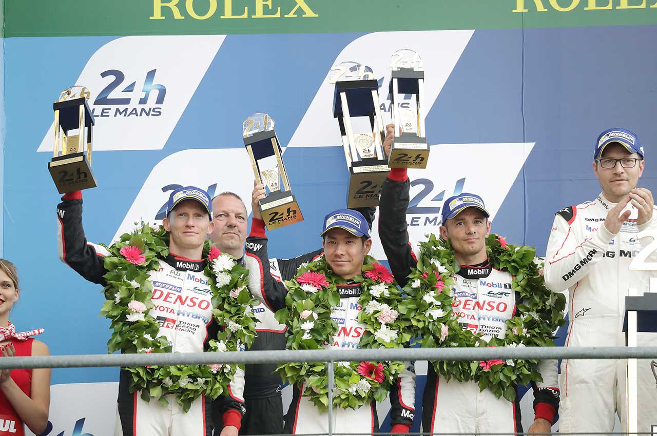ル・マン/WEC フォト 【写真1207】2016ル・マン24時間 表彰台でトロフィーを掲げるトヨタ6号車のドライバー 投稿日: 2016.06.20 01:50 2016ル・マン24時間 表彰台でトロフィーを掲げるトヨタ6号車のドライバー © Toyota