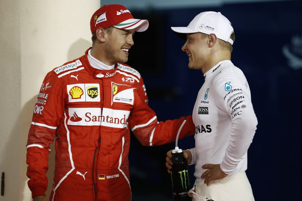 F1 フォト 【写真1】2017年第3戦バーレーン セバスチャン・ベッテル(フェラーリ)とバルテリ・ボッタス(メルセデス) 投稿日: 2017.04.16 10:06 2017年第3戦バーレーン セバスチャン・ベッテル(フェラーリ)とバルテリ・ボッタス(メルセデス) このフォトが使われている記事へ © LAT