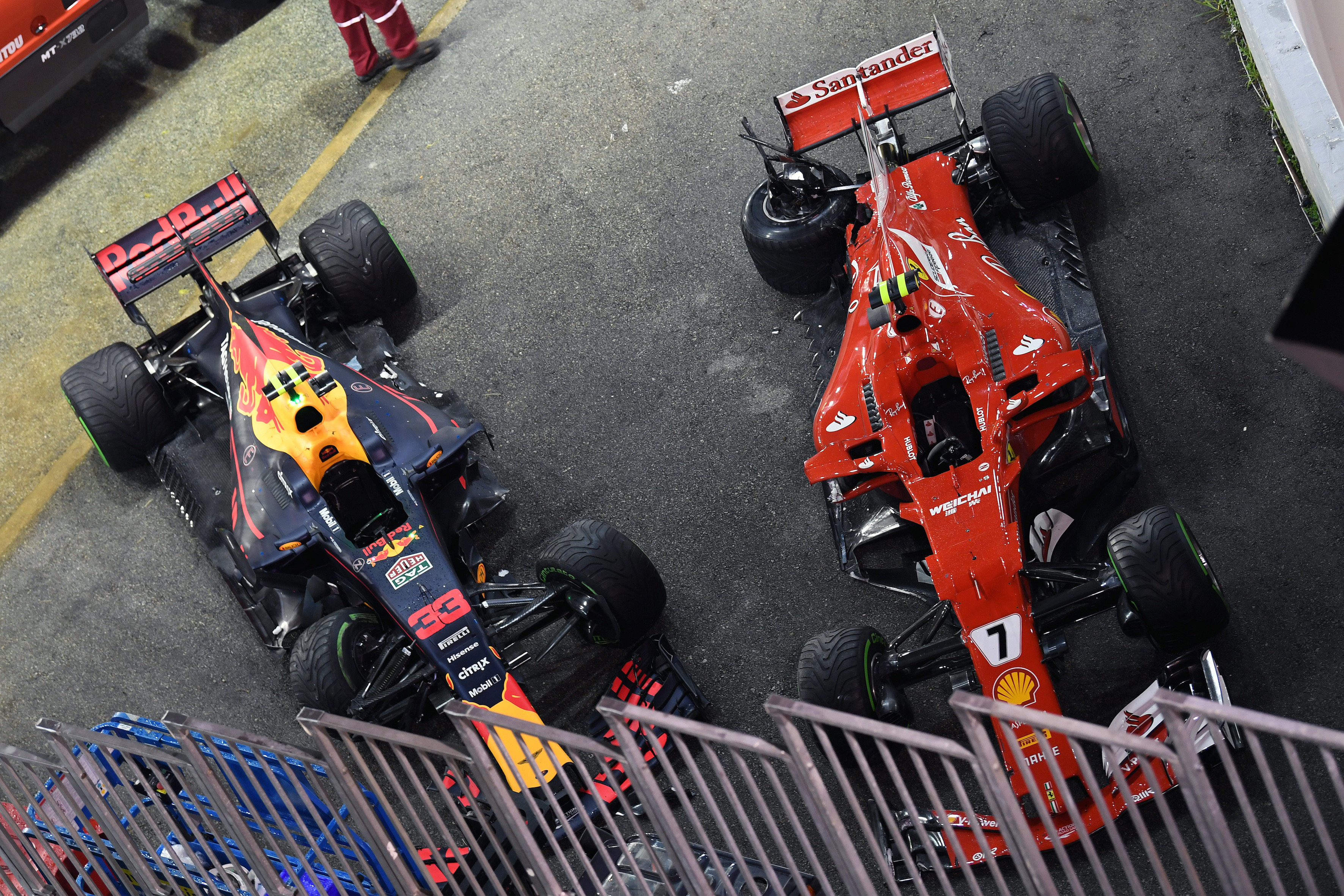 F1 フォト 【写真1】2017年F1シンガポールGP 投稿日: 2017.09.20 14:31 クラッシュによりダメージを負ったフェルスタッペンとライコネンのマシン このフォトが使われている記事へ © Sutton
