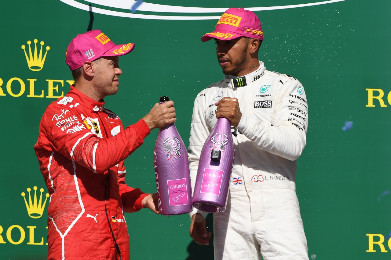 F1 フォト 【写真1】2017年F1第17戦アメリカGP セバスチャン・ベッテルとルイス・ハミルトンが健闘を称えあう 投稿日: 2017.10.23 15:07 2017年F1第17戦アメリカGP セバスチャン・ベッテルとルイス・ハミルトンが健闘を称えあう このフォトが使われている記事へ © Sutton Images