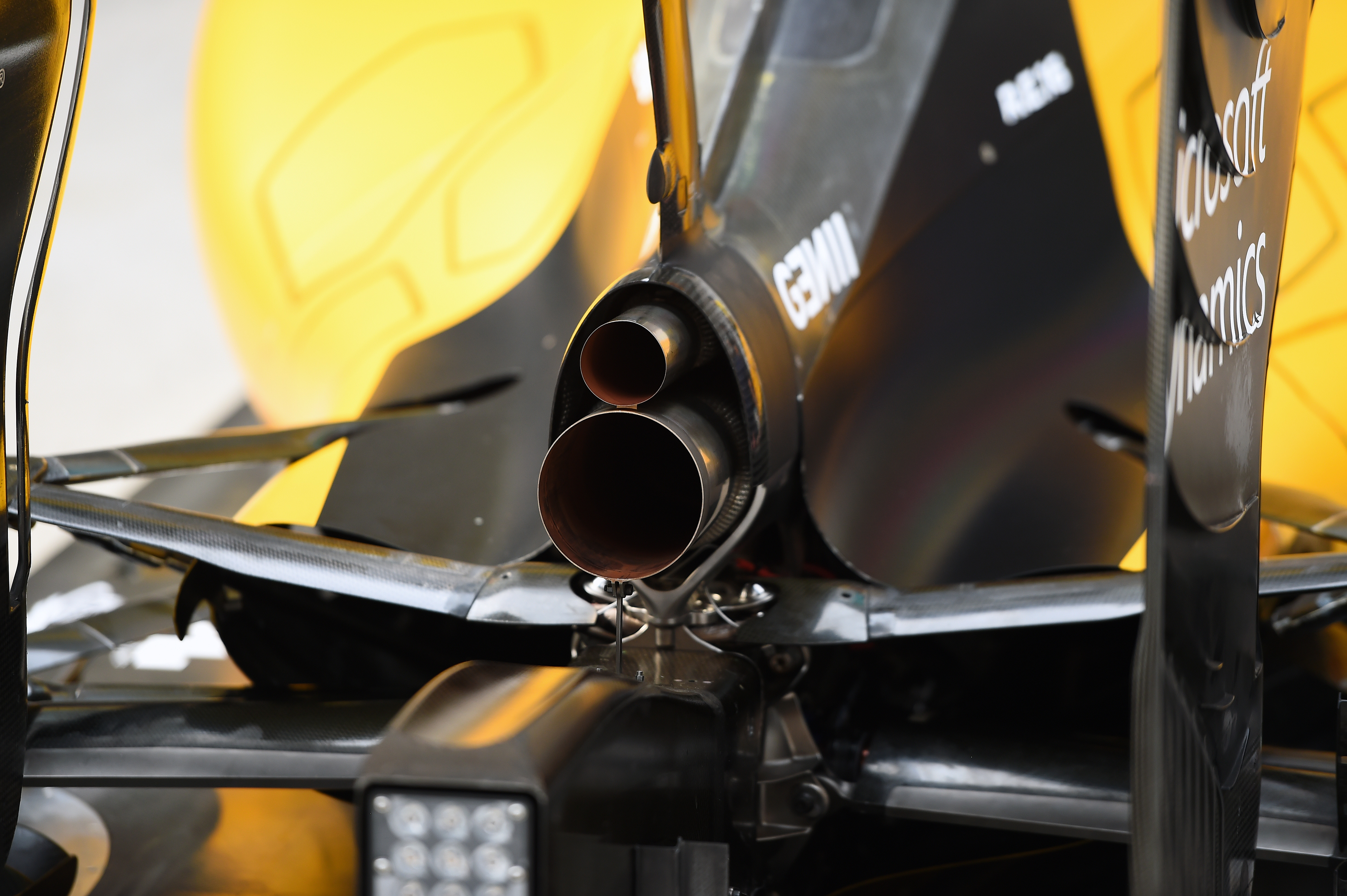 ルノーの場合もメルセデスと同じで、カウルの絞り込みを重視したのだろうか。ウェイストゲート専用テールパイプが1本ということは、ウェイストゲートも1基? テールパイプの上流も気になるところだ。