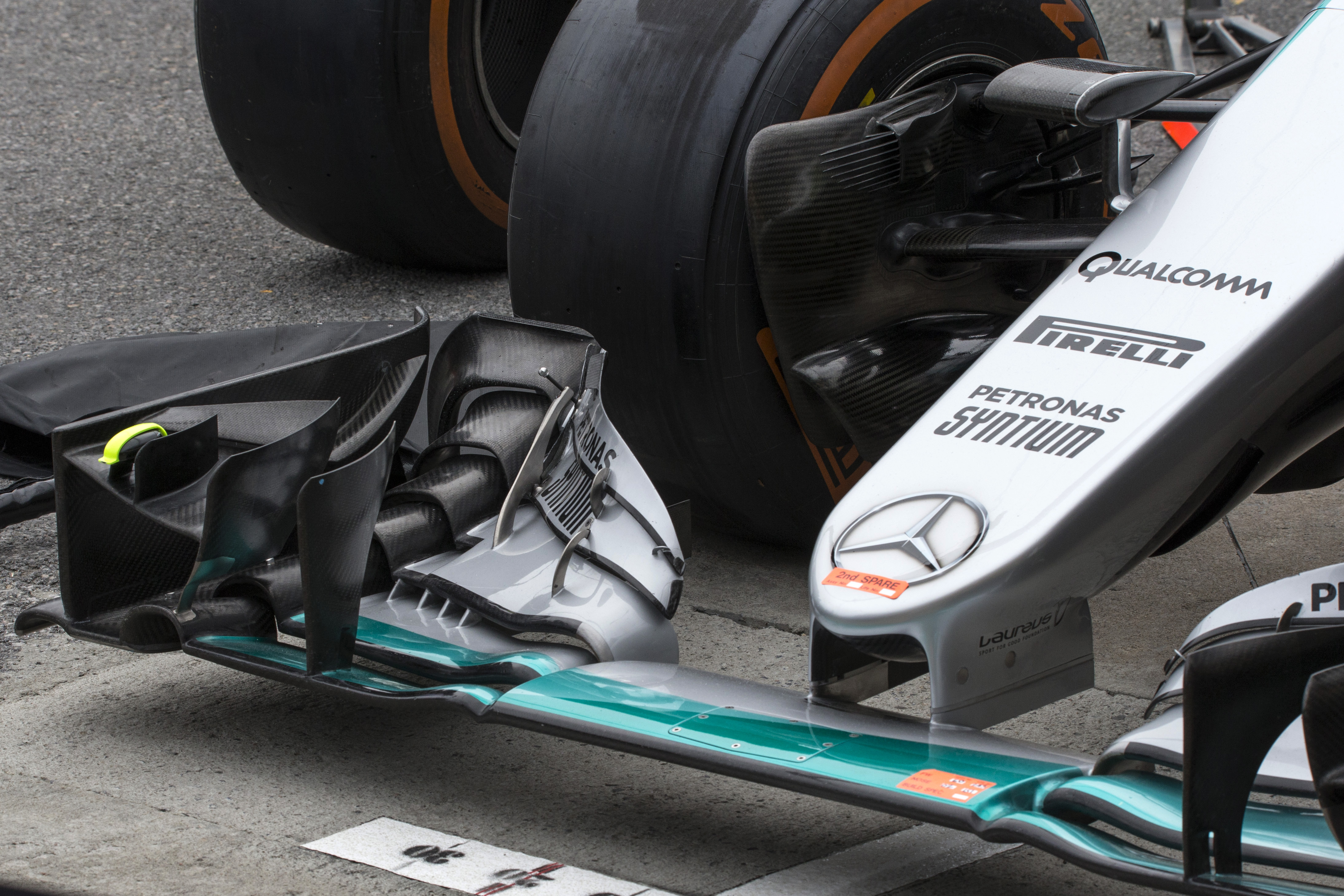 つづいてフロントセクションを見てみると、その繊細かつ大胆な作りに目を奪われる。第5戦スペインGPでウイングステーのスパンを細くした改良型ノーズを投入したが、狙いは、ノーズとフロントウイングに挟まれた空間を大きくとり、リヤに向けてクリーンかつ大量の空気を流すためである。規定いっぱいまで後退させたスリムなノーズも、リヤに流す空気のためだ。