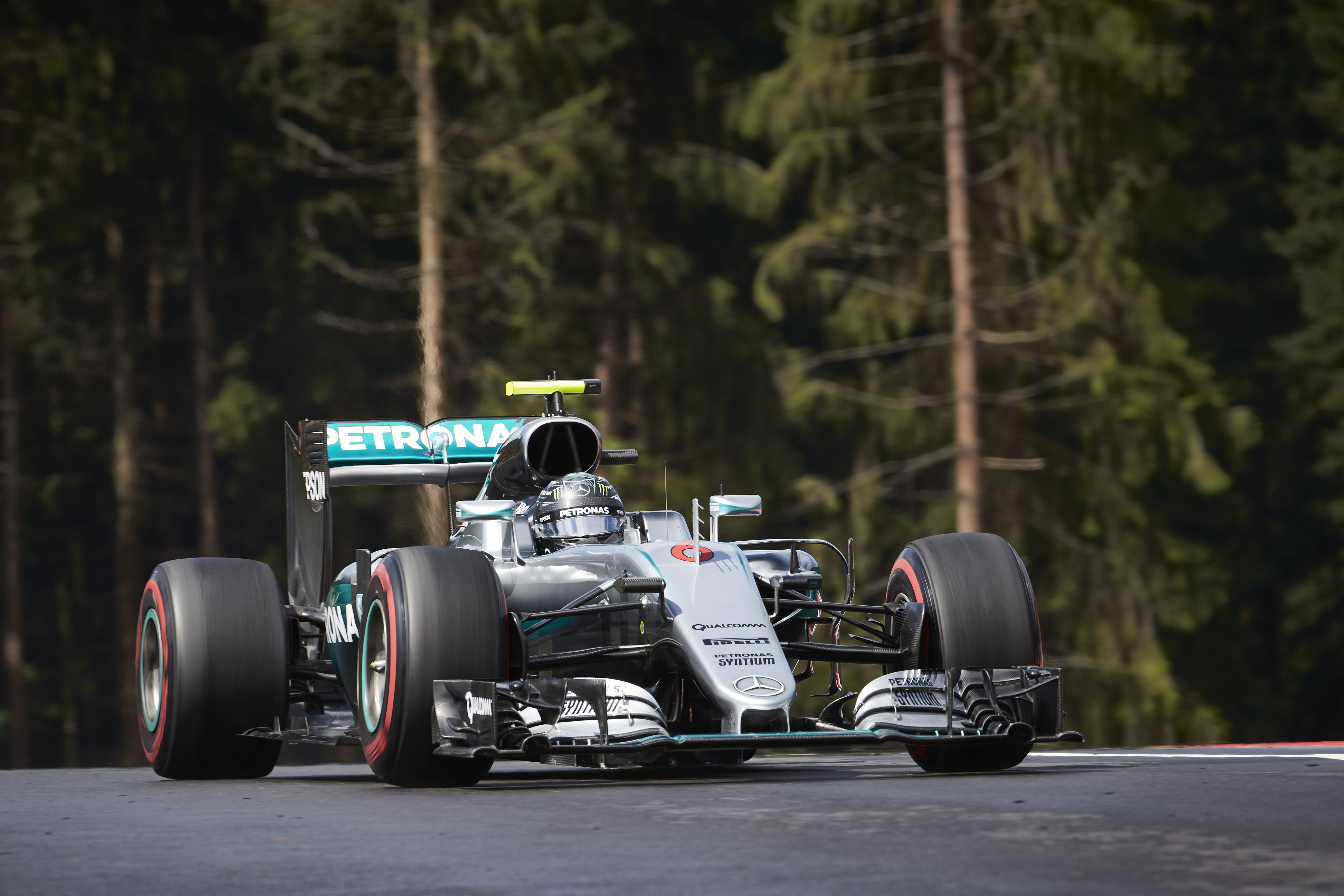 ロズベルグ、グラベルに飛び出しつつもトップ発進。縁石でトラブル発生