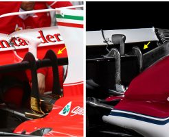 ザウバーの我が道を行く姿勢はそれだけに留まらず、サイドポッド上部に2ヶ所の空気穴を開けた(赤矢印)。これは1987-89年のベネトンを思い起こさせるものである。これはおそらくターボに新鮮な空気を取り込むためで、ヘルメット上のエアインテークはERSやトランスミッション、エンジン本体を冷却するためのラジエターに回していると思われる。