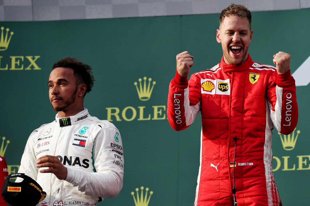 F1 フォト 【写真1】2018年F1第1戦オーストラリアGP 2位のルイス・ハミルトン(メルセデス)と優勝したセバスチャン・ベッテル(フェラーリ) 投稿日: 2018.03.30 07:31 2018年F1第1戦オーストラリアGP 2位のルイス・ハミルトン(メルセデス)と優勝したセバスチャン・ベッテル(フェラーリ) このフォトが使われている記事へ © XPB Images