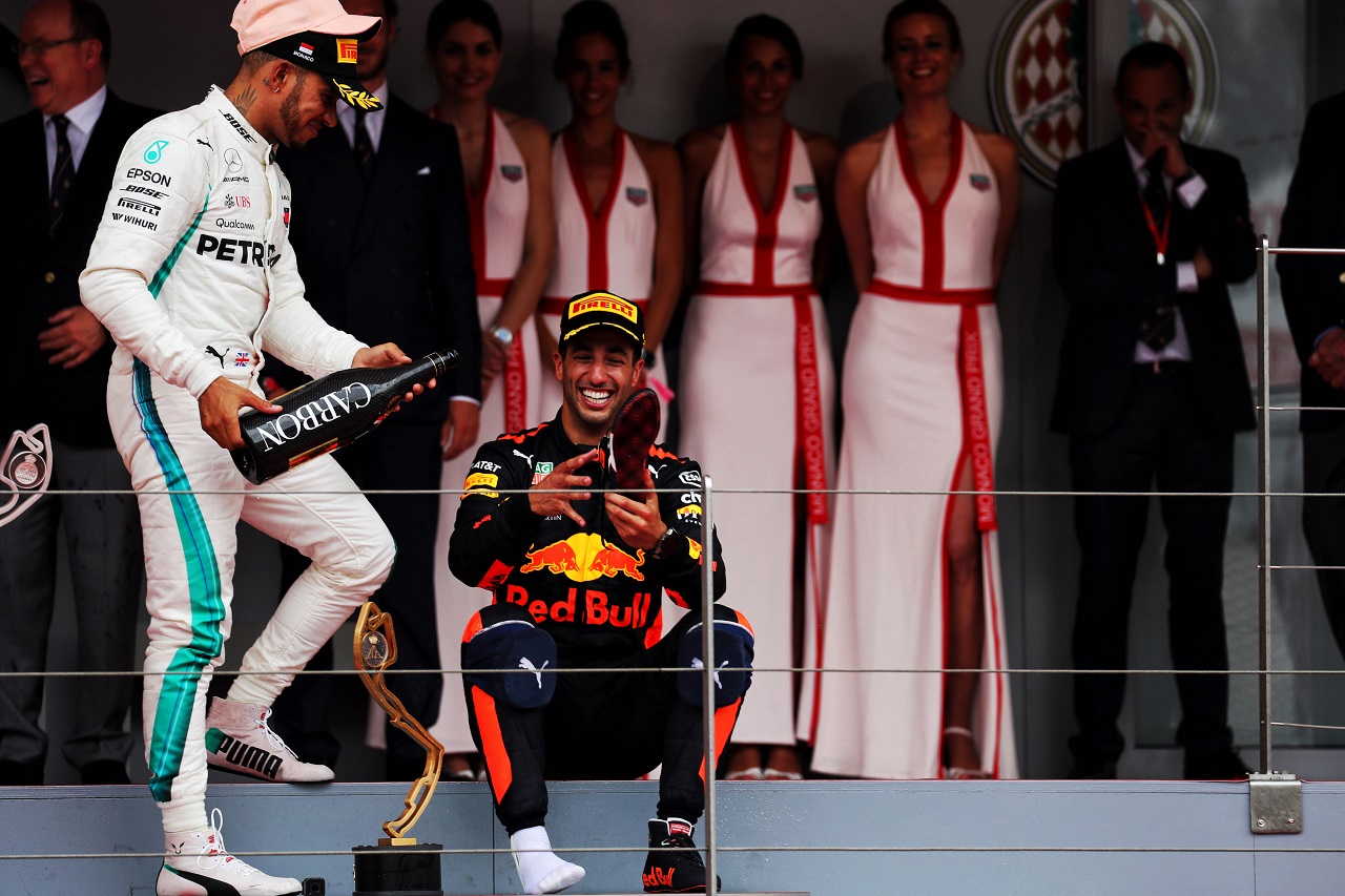 F1 フォト 【写真1】2018年F1第6戦モナコGP ルイス・ハミルトン(メルセデス)がウイナーのダニエル・リカルド(レッドブル)にシューイを促す 投稿日: 2018.05.28 15:20 2018年F1第6戦モナコGP ルイス・ハミルトン(メルセデス)がウイナーのダニエル・リカルド(レッドブル)にシューイを促す このフォトが使われている記事へ © XPB Images