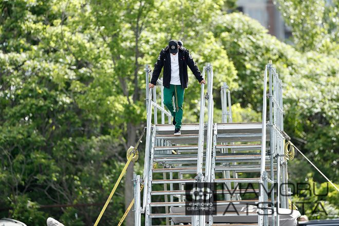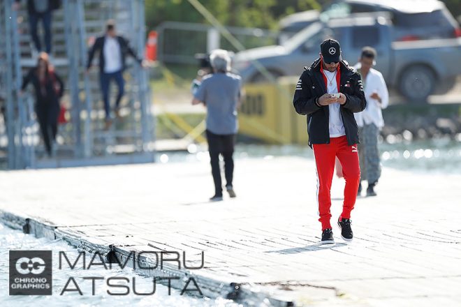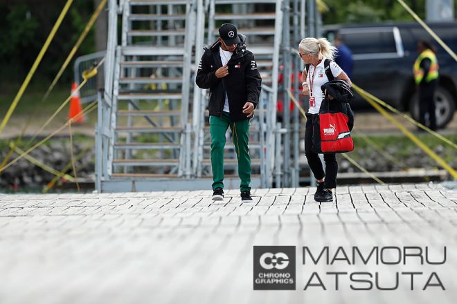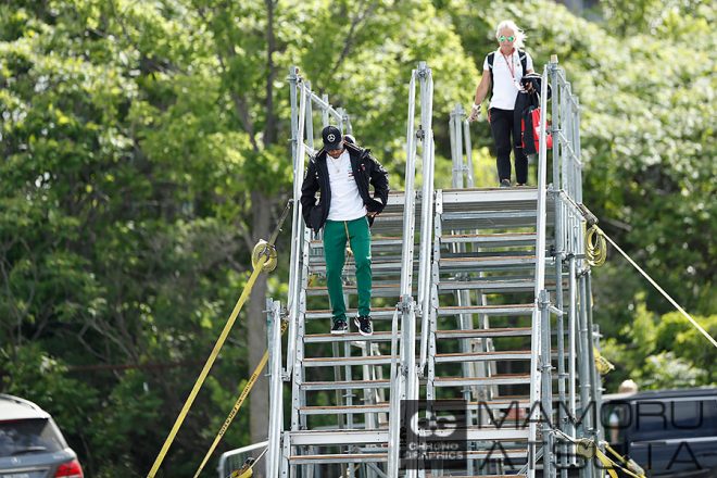 駐車場とパドックを結ぶ橋で毎年ドライバーの出勤風景を撮影するのですけど、金曜日のルイス・ハミルトン選手のジャージが赤!