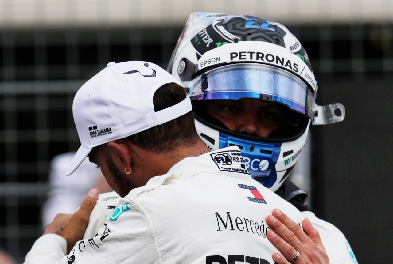 F1 フォト 【写真1】2018年F1第8戦フランスGP フロントロウ独占を喜ぶバルテリ・ボッタスとルイス・ハミルトン(メルセデス) 投稿日: 2018.06.24 14:04 2018年F1第8戦フランスGP フロントロウ独占を喜ぶバルテリ・ボッタスとルイス・ハミルトン(メルセデス) このフォトが使われている記事へ © XPB Images