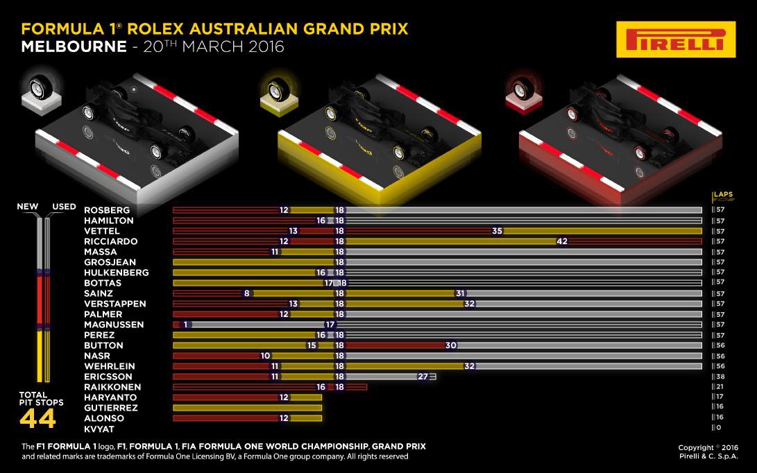 F1 フォト 【写真1】インフォグラフィックスで見る2016 オーストラリアグランプリ決勝 投稿日: 2016.03.21 19:26 インフォグラフィックスで見る2016 オーストラリアグランプリ決勝 このフォトが使われている記事へ © PIRELLI このフォトが使われている記事へ © PIRELLI