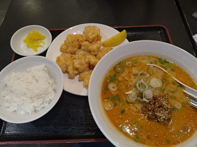 中華屋さんの定食。担々麺と海老のマヨ揚。