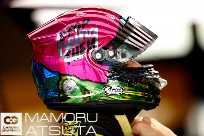 夜のレースに合わせて、スペシャルカラーのダニエル・リカルド選手のヘルメット。