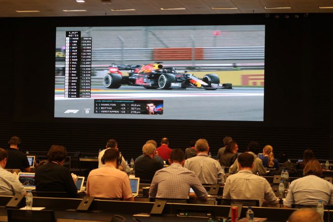ヤス・マリーナのメディアセンターは、レースが終わったあともエンドレスでレースの中継録画を流し続けてました。