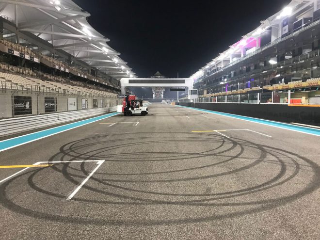 このドーナツターンの跡は、手前がフェルスタッペン、奥がハミルトンですね。