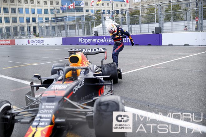そろそろ残り周回数も短くなってきたので、フェルスタッペン選手とチームクルーが喜ぶ姿の写真を撮ろうと考えて場所とレンズの選択をしていた時に、背後でドカンと音が聞こえて、見てみたらなんとフェルスタッペン選手が……