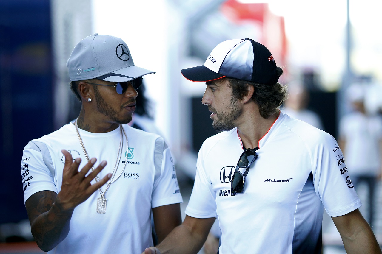 F1 フォト 【写真1】ルイス・ハミルトンとフェルナンド・アロンソ 投稿日: 2016.12.06 07:05 ルイス・ハミルトンとフェルナンド・アロンソ このフォトが使われている記事へ © Sutton Images