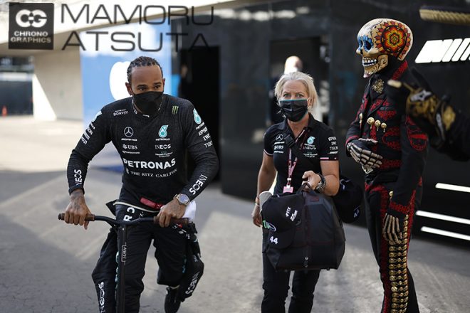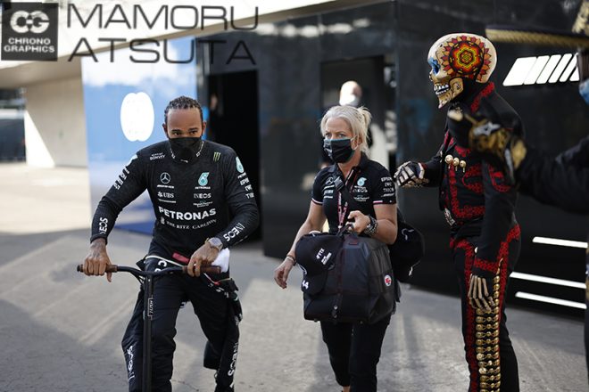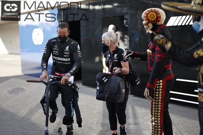 FP2が終わって、ガレージからホスピタリティーまで戻るまで、キックスクーターで移動するハミルトン選手。