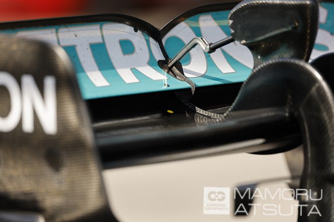 ハミルトン選手のリアウイング。中央の銀色の棒が引っ張られて、パカっとブルーのウイングエレメントが水平方向に上がります。