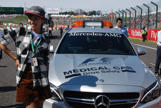 セーフティーカーとグリッドガール風に記念撮影をしていたら動き始め、