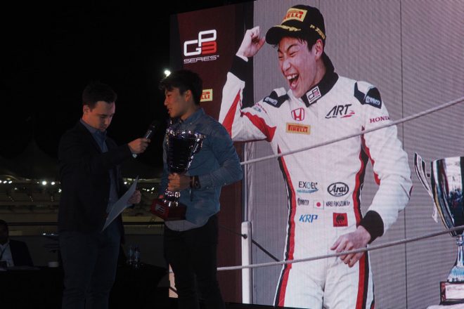 レース後には恒例のF2、GP3表彰式が行なわれ、GP3で選手権3位に入った福住仁嶺くんが登場。来季はF2で活躍してね。F1で待ってますよ。