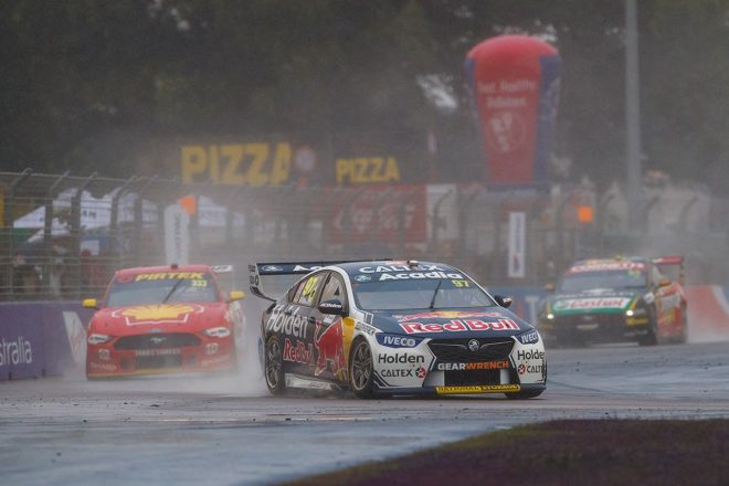 セカンドルーティンは45周過ぎとまだまだ先のため、路面コンディションに合わせたこの判断はギャンブルだったが、数周も経たぬうちに雨は強さを増し、上位勢が続々とウエットへとチェンジする判断を下したことで、SVGがゲインを獲得。しかしそのSVGをさらに上回り、SCピリオド中にすでにウエットを履いていたエレバスのアントン・デ・パスカーレ(ホールデン・コモドアZB)が、全車ウエット装着で一巡したところで首位に踊り出る。