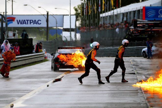 このインシデントでBJRのパーカットには15秒ペナルティが下されると、さらにコース上では別のマシンによるクラッシュが発生し、この日2度目のSCがコースイン。すると最後の燃料給油に飛び込んだパーカットのホールデンは、燃料給油装置の不具合かリグの圧力弁が開いたことでエキゾーストの熱が伝わって引火し、炎上する事故が発生。マシンとガレージの一部を焼く事態となってしまう。