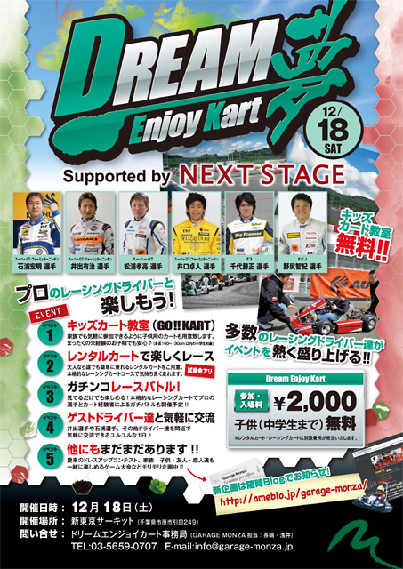 千葉県市原市の新東京サーキットで、“子供から大人までモータースポーツを身近に感じる”を主旨として、プロドライバー6人が参加する予定だったイベント『DREAM Enjoy Kart』が、12月18日(土)に改めて開催されることとなった。当初10月末に行われる予定だったが、台風のために順延されていたものだ。
