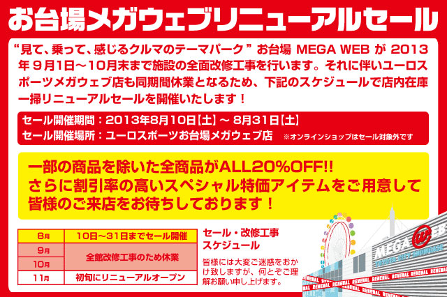 『ユーロスポーツ お台場メガウェブ店』は、店舗のあるお台場メガウェブが9月1日から10月末まで全施設改修工事のため休業となってしまうことを受けて、8月10日(土)~8月31日(土)までの期間で“在庫一掃リニューアルセール”を行う。