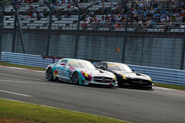 その後、順位の変動はなく、23周目にピットイン。このとき、深刻なトラブルがミクSLSを襲った。なかなかタイヤが装着できずに、20秒ほどロスしてしまう。さらに、ピットから出て行った直後に谷口選手からも悲痛な無線が入る。なんと、右フロントのタイヤが外れそうになっているという。1コーナーを抜けた先で発生したため、丸々1周スロー走行を強いられ、緊急ピットイン。