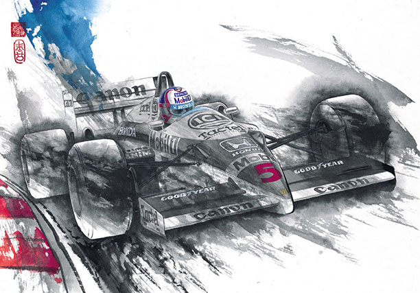 このシリーズは、墨で描かれた迫力満点のF1マシンを版画化したもの。第1弾として1985年のアイルトン・セナ+ロータス97Tが発売されていたが、今回は第2弾としてナイジェル・マンセル+ウイリアムズFW11(1986年)を新発売。人気を博しているという。