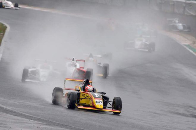 日曜日の第2戦は雨のため、セーフティーカー先導でのスタートとなりました。予選3番手グリッドに着けた山田真之亮の前には銘苅選手と川端選手。レースはセーフティーカーが2周で入り、3周目から戦いが開始。しかし再開直後に銘苅選手が最終コーナーでスピン、それを避けようとした川端選手が接触し、サスペンションにダメージを受けた為にそのまま第1コーナーでコースアウト。労せずしてトップに立った山田真之亮でしたが、ストレートエンドのヘヤピンで痛恨のコースアウト。2戦連続のリタイアに終わりました。
