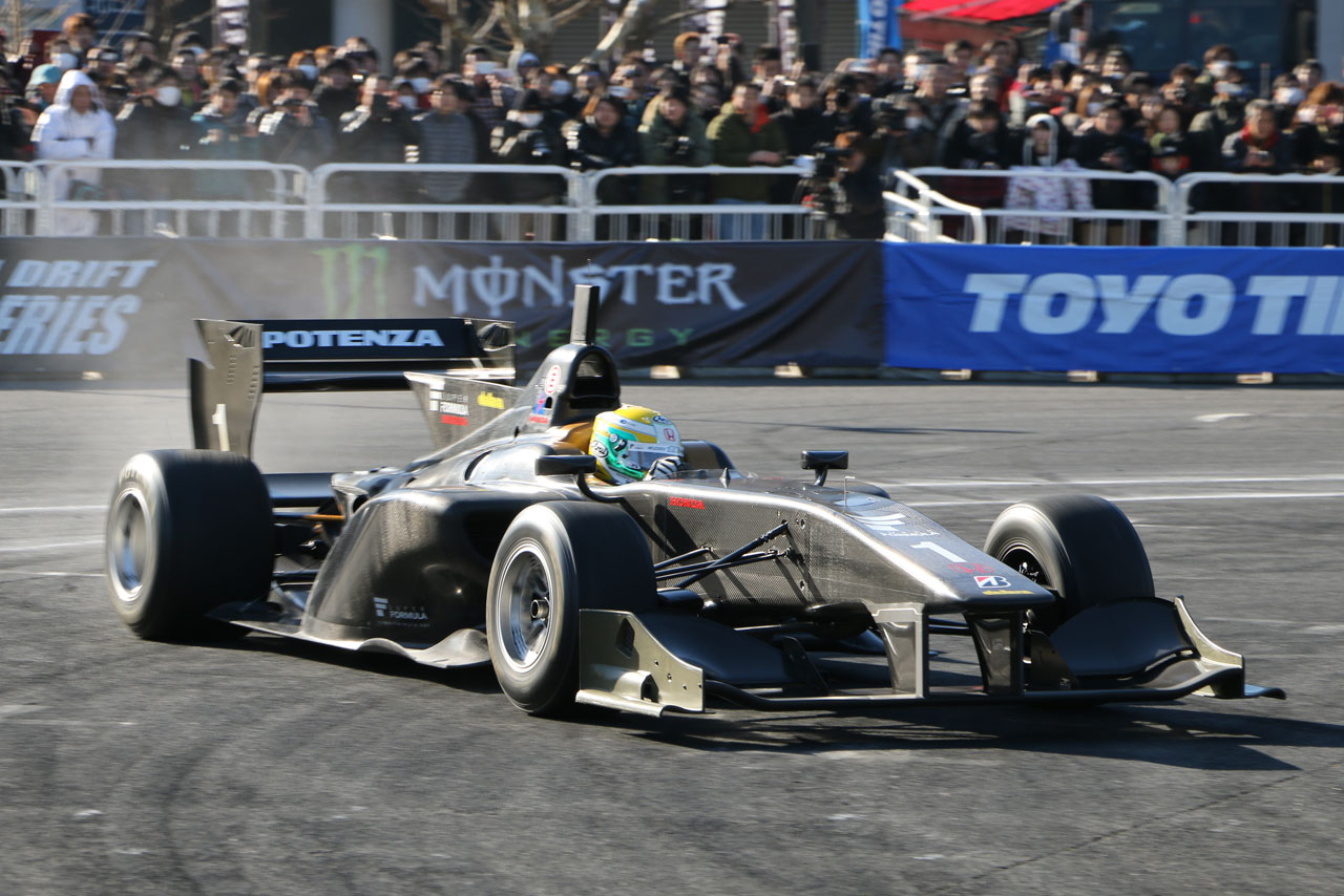 2014年東京オートサロンでのスーパーフォーミュラデモランの様子。15年もオートサロンの会場でスーパーフォーミュラのデモランとトークショーが開催されることになった。