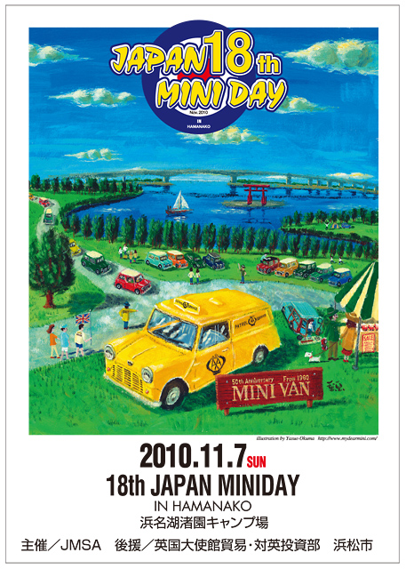 ポスターや広告のイメージイラストはBigBeer大熊氏によるミニデイのための書き下ろしです。大平洋を望む浜名湖とフィールドに集まるミニ、そしてテーマカーのミニVAN。ほのぼのとした大熊ワールドが広がります。