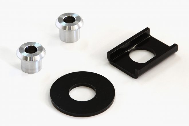 R.E.D. ダイレクトシフトアダプターは「マウントスペーサー」と「シフトレバーリテーナーカラー」の2 種類のパーツにより構成されています。「マウントスペーサー」は、純正のミッションマウントに挟み込んで装着する事で、トランスミッションの不要な動きを抑えます。