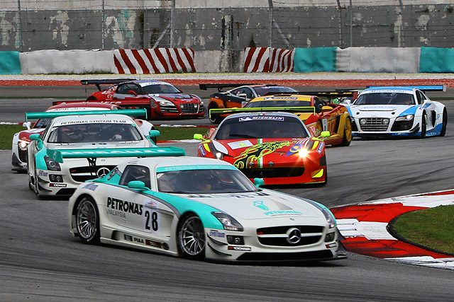 アウディR8 LMSやフェラーリ 458 GT3、ランボルギーニ ガヤルド LP560 GT3などのGTカーが一同に会したGTクラス。世界の耐久レースで名を馳せるドライバーも多く参加するこの戦いにおいて、PETRONAS SYNTIUMチームは、まず予選でインパクトある活躍を披露。3選手のアタックタイムを合算する予選で、28号車がデビューレースながらポールポジション獲得に成功しました。