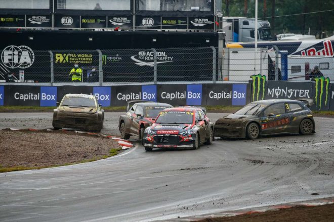 Q3開始前から強まった雨脚によりマッドコンディションと化したセミファイナル1は、クリストファーソン、エクストローム、アンドレアス・バッケルド(ルノー・メガーヌR.S.RXスーパーカー/モンスターエナジー・GCK RXカルテル)のトップ3となり、一方のセミファイナル2からはニクラス、ティミー、そしてもう1台のヒュンダイとなるティマー・ティマジャノフ(ヒュンダイi20 RXスーパーカー/GRXテネコ)という顔ぶれがファイナルへと進出する。