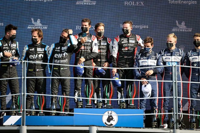 • 優勝し表彰台に立つ7号車GR010ハイブリッドのクルー