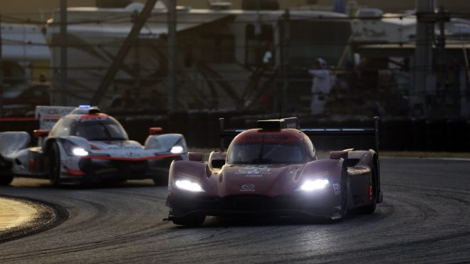 • デイトナ・インターナショナル・スピードウェイのオーバルを走行する77号車マツダRT24-P DPi