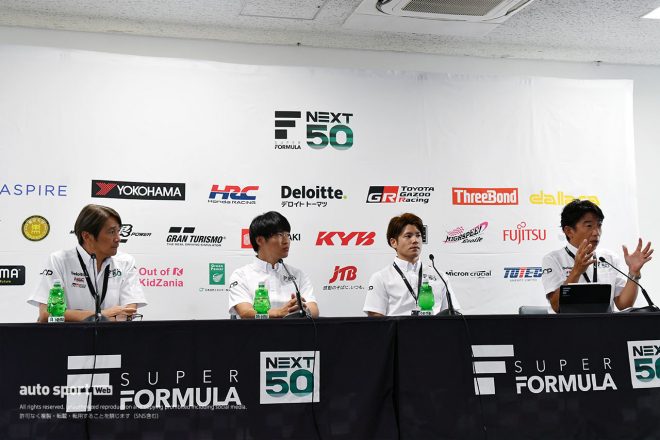 • 2023スーパーフォーミュラ第7戦もてぎ 予選後会見に登壇した野尻智紀(TEAM MUGEN)、太田格之進(DOCOMO TEAM DANDELION RACING)、リアム・ローソン(TEAM MUGEN)