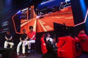 当然、このアウディe-tron・ビジョン・グランツーリスモは、実車としても存在するマシンだが、グランツーリスモ内で自由にドライブすることができる。今回は会場に設営された試遊台を使ってレースが行われたが、それに先立ち“デモラン”を行ったのは、スーパーGTでHitotsuyama Audi R8 LMSをドライブする富田竜一郎だ。
